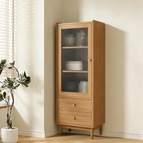 Fukaio Tall Bookcase With Fluted Glass Door & 2 Drawers, Modern Storage Cabinet With Tempered Glass, Narrow Wood Bookshelf Organizer For Home Office, Living Room, Kitchen Pantry(Natural,2-Tier)
