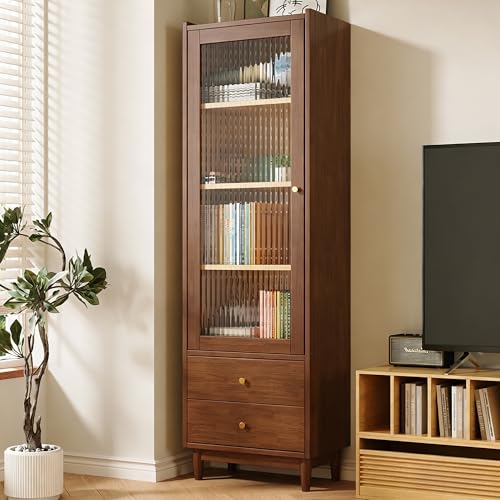 Fukaio Tall Bookcase With Fluted Glass Door & 2 Drawers, Modern Storage Cabinet With Tempered Glass, Narrow Wood Bookshelf Organizer For Home Office, Living Room, Kitchen Pantry(Brown,4-Tier)