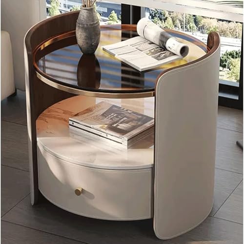 GddOGUK 2-tier Round Nightstand Creative Bedside Table with Tempered Glass Top End Side Table with Drawer and Shelf Night Stand(Wei�)