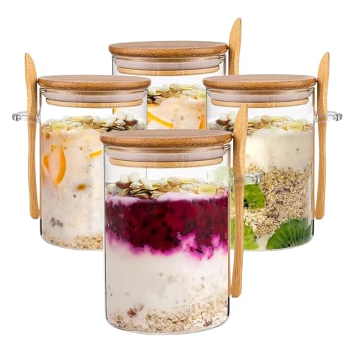 VITEVER 4-pack 16oz Overnight Oats Containers with Bamboo Lids, Glass jars with Airtight Lids, Wide mouth Mason Salad jars, Glass Food Storage Containers for Snacks Yogurt Spice Sugar