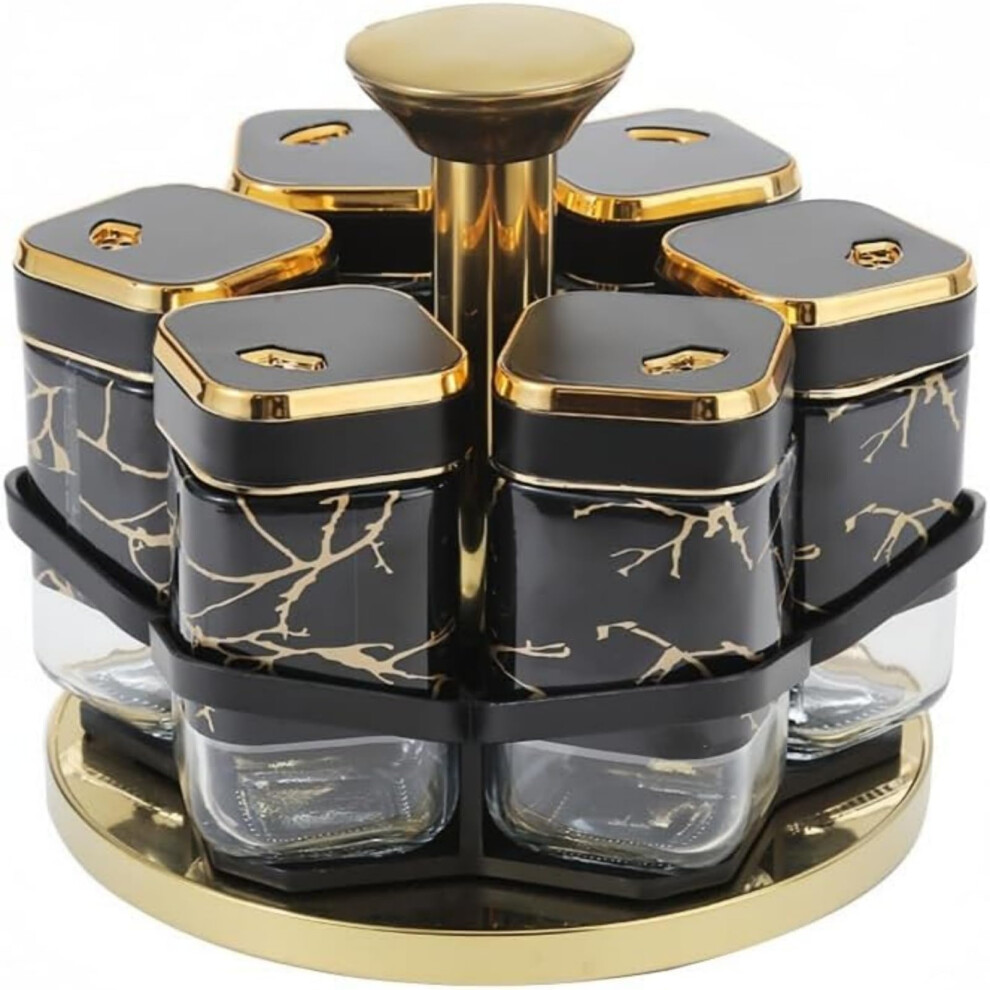 Spice Rack Organizer 360 Rotating with 6 Glass Jars for Kitchen Countertop Storage Black Gold