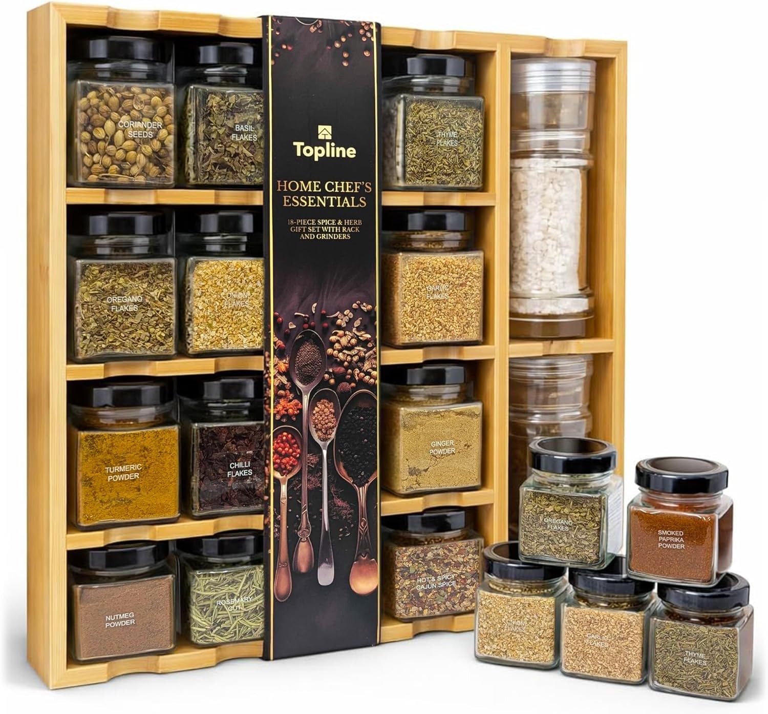 Topline Wooden Spice Rack with Glass Jars & Grinders for Kitchen Storage