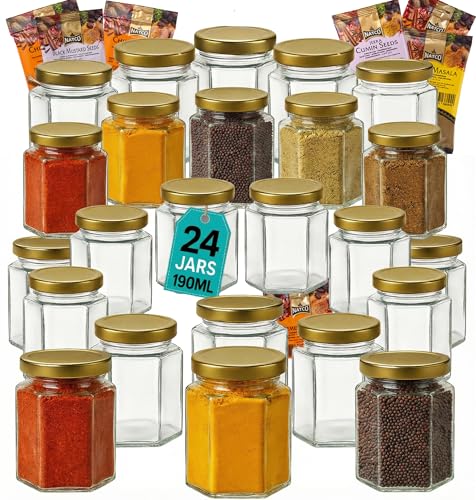 Offer Shop 190ml Glass Jars with Lids Storage Mason Jar with Gold Lid- 8 Spices | 24 Hexagonal Jars with Sticker Labels Airtight Food-Grade Containers for Jam, Spices, Pickles, Candle Making