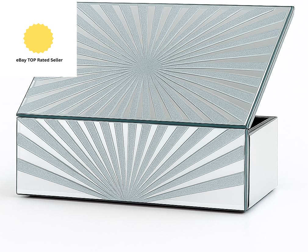EagleWiz SunRays Glass Mirrored Sunburst Jewellery Box Sun Rays Modern Silver Trinket Storage Box Earrings Rings Jewelry Keepsake Display Case