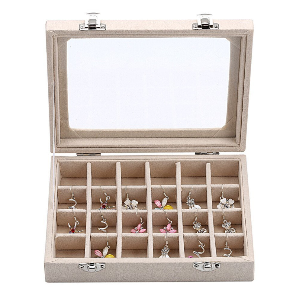Beige 24 Slot Velvet Glass Jewelry Box Organizer Rings Earrings Tray Display Storage Case
