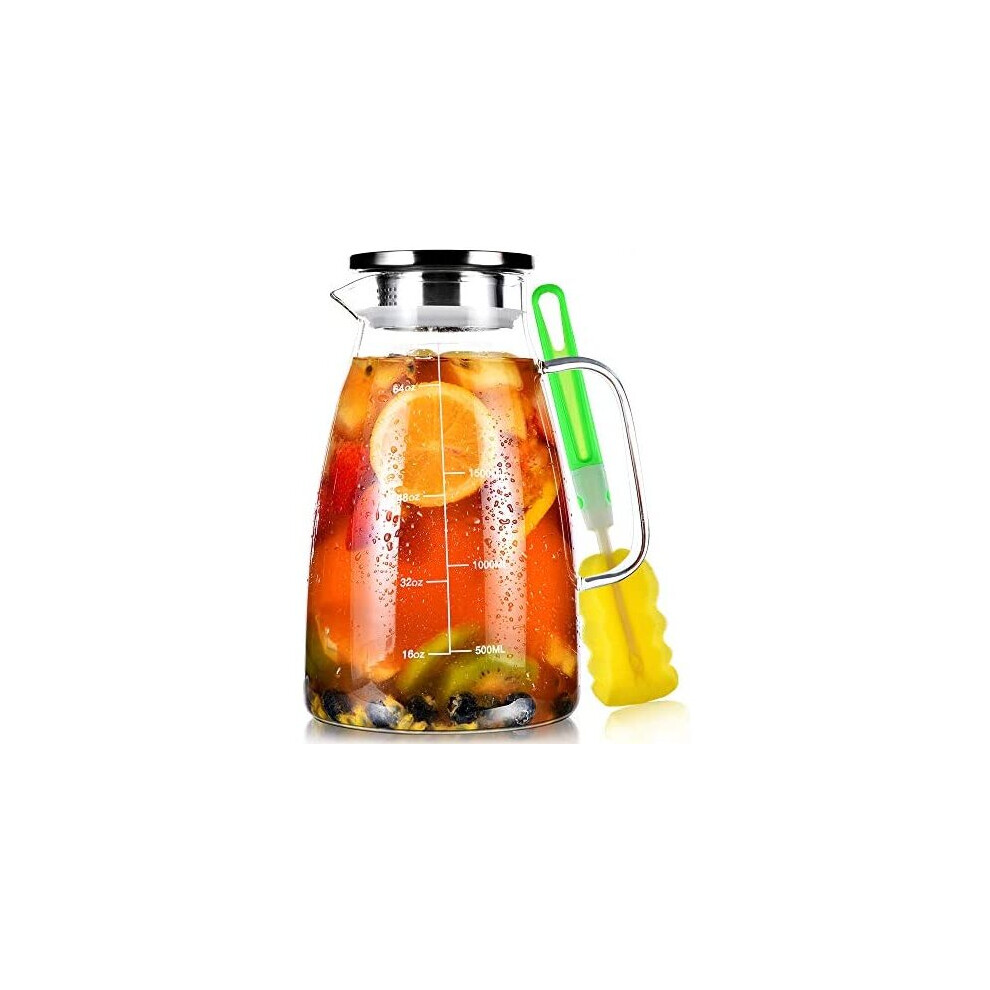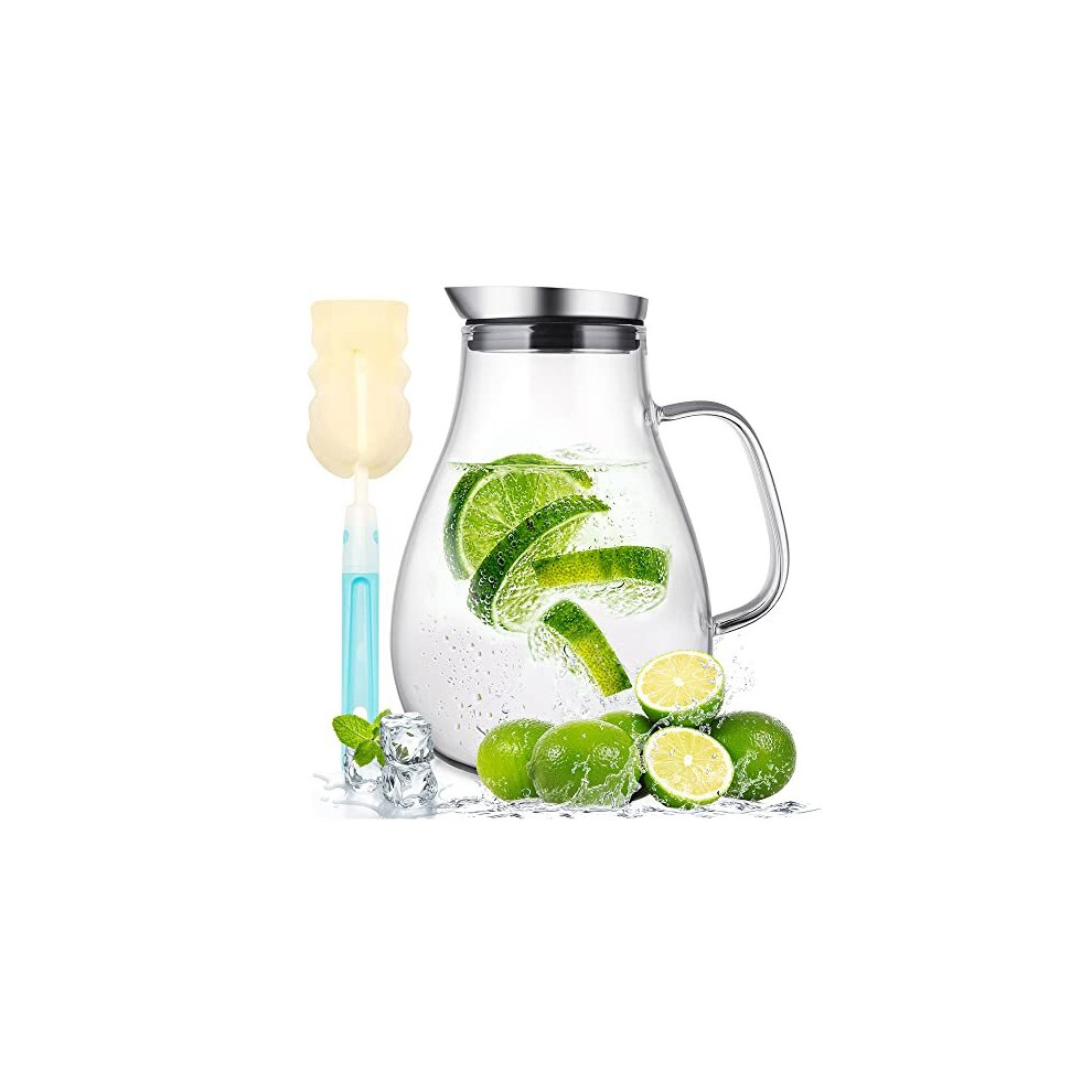 SUSTEAS 2.0 Litre Glass Jug with Lid, Water Carafe Jug for Hot/Cold Water, Iced Tea and Juice Drink, 1 Long-Handled Brush Included