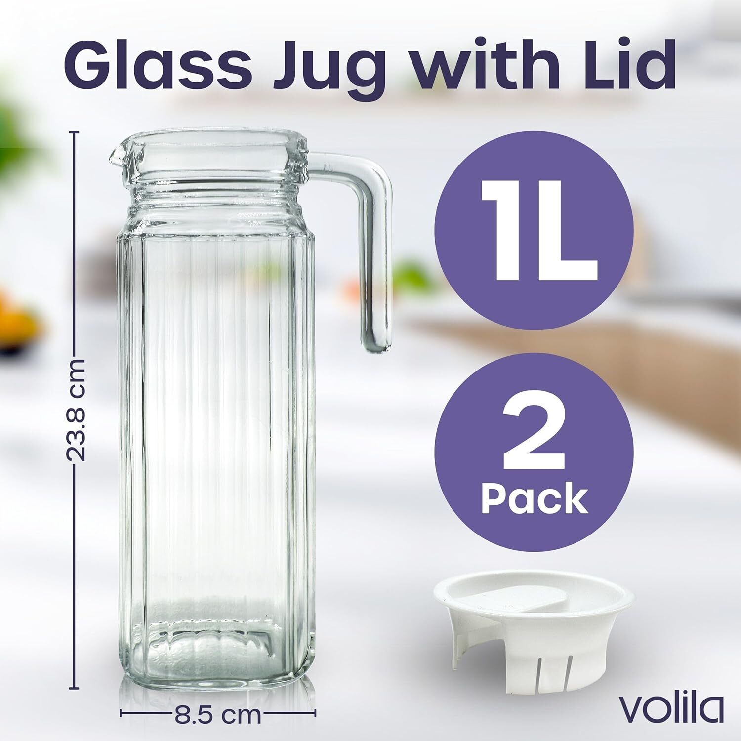 2 Pack 1L Glass Water Jug with Lid & Spout - Clear Ribbed Pitcher for Fridge