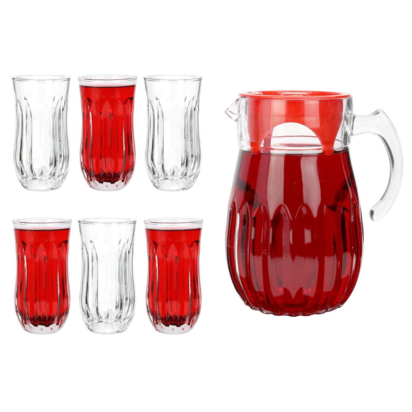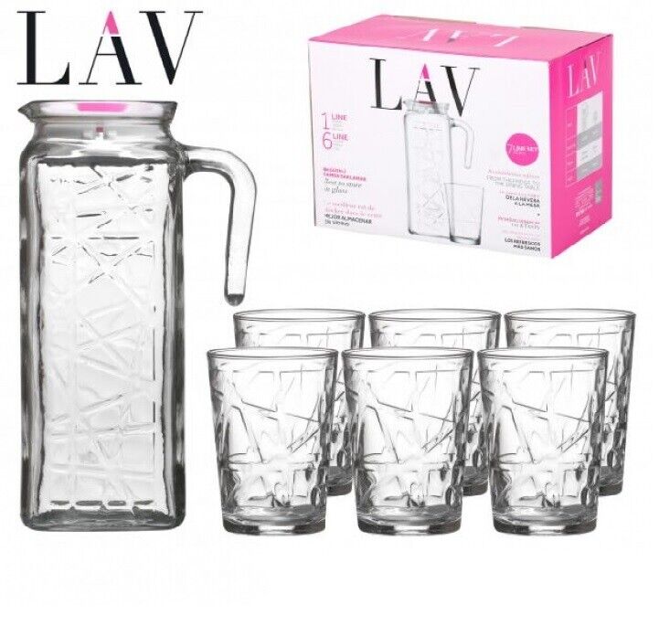 LAV Glass Pitcher Decanter Jug with Lid and 6 Tumbler Glass Set Garden Home Juic