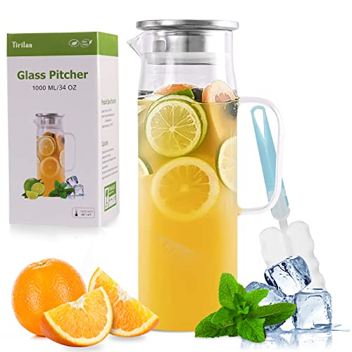 Yirilan Water Jug,35 OZ / 1Liter Glass Jug with Lid,Small Glass Pitcher,Water Carafe with Lid,Borosilicate, Iced Tea Pitcher