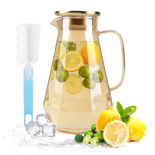 2L Glass Jug with Lid & Cleaning Brush, Borosilicate Heat-Resistant Glass Pitcher for Iced Tea, Sangria, Cocktail, Juice, Milk, Coffee - Hot & Cold Beverage Carafe (Amber)
