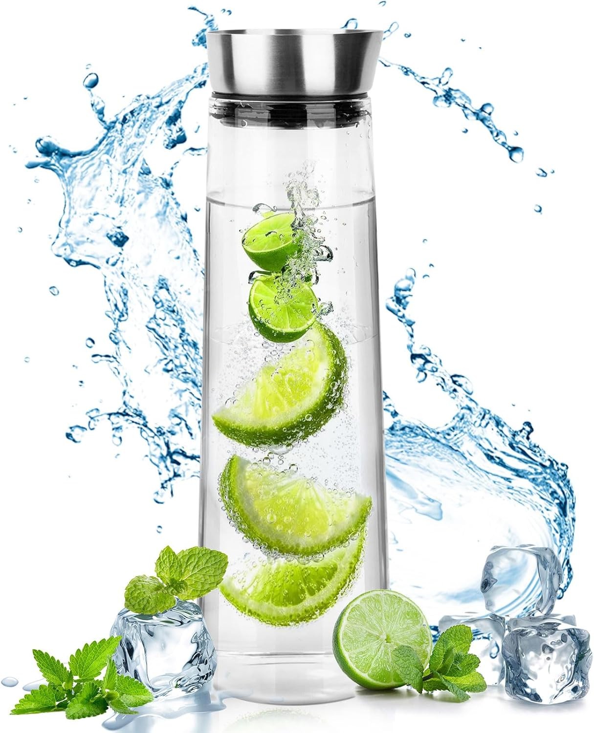 Buwico 1L Glass Carafe Glass Water Jug Borosilicate Glass Jug with Stainless Steel Lid for Water, Milk, Juice, Iced Tea, Lemonade and Sparkling Drinks