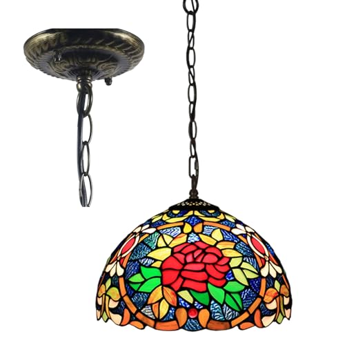XANAYXWJ Pendant Light Fixture Rose Dragonfly Sunflower Stained Glass Lamp Shades Hanging Pendant Lamp Vintage Yellow Red Sea Blue Green Flower Home Decor Chandelier Wide 12",Rose