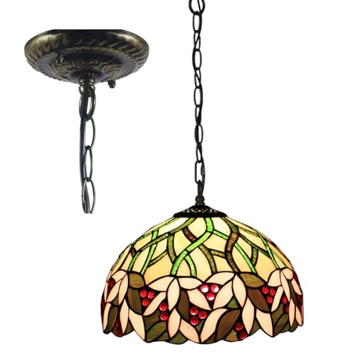 XANAYXWJ Pendant Light Fixture Grape Style Stained Glass Lamp Shades Hanging Pendant Lamp Vintage Pink Blue Red Flower Green Leaf Glass Beads Home Decor Chandelier Wide 12 Inch Height 39 Inch,N