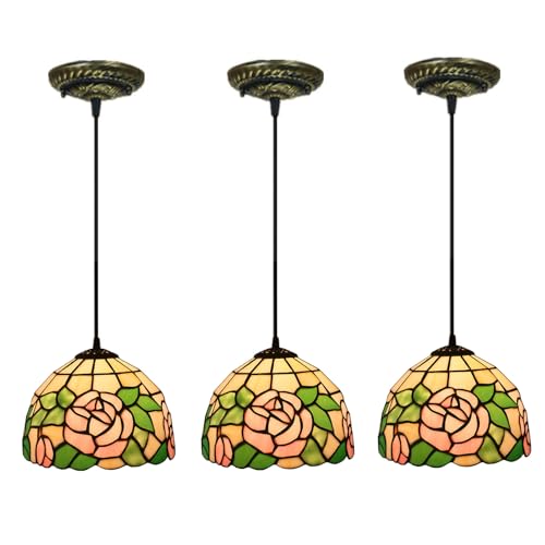 LYGXWJFC Pendant Light Fixture Rose Stained Glass Lamp Shades Hanging Pendant Lamp Vintage Pink Flower Green Leaf Home Decor Chandelier Wide 8" Height 39" for Kitchen Island Dining Room,3pcs