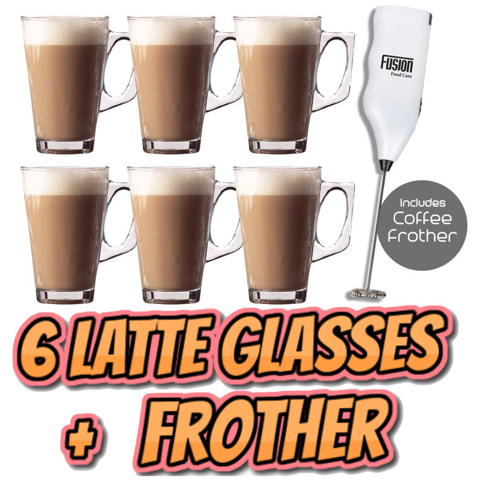 6 X Latte Coffee Glasses and Cappuccino Frother Lattes Tea Glass Cups Mugs Set