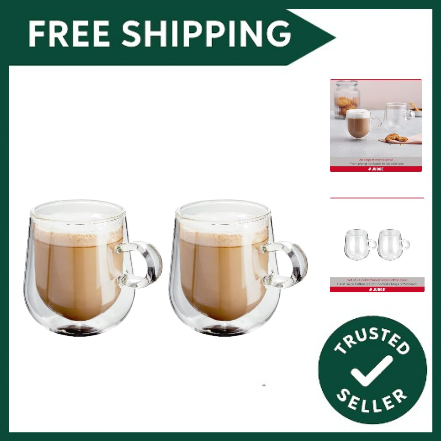 Judge Double Walled Glass Coffee Cups, Set of 2 Latte Glasses, 275 ml Each, Hand