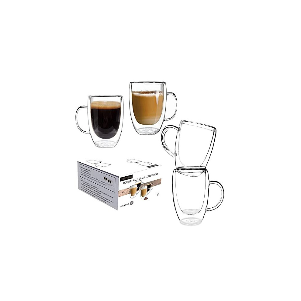 CxutSa 4x450ML Double Walled Glass Coffee Mugs with Coaster Latte Glasses Cappuccino Espresso Cups Large Borosilicate Insulated Coffee Cup for Tea Milk Juice Ice Cream Dessert Beer Hot Cold Drinks