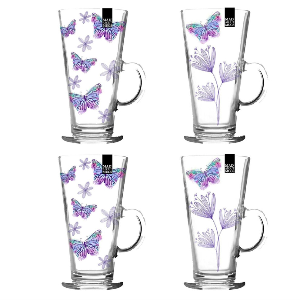 Set of 4 Latte Glasses Butterfly Clear Glass Coffee Mug Tea Chocolate Kitchen
