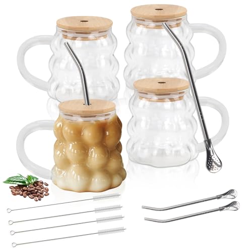 FOGAWA 4PACK Glass Coffee Mugs 350ML Latte Glasses Coffee Glasses with Handles Iced Coffee Cup with Bamboo Lid Straw Glass Cups Grape Shape Drinking Glasses for Cappuccino Milk Juice Tea Beer