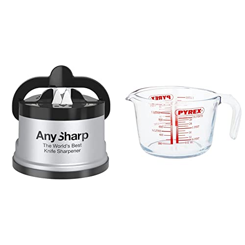 AnySharp Knife Sharpener with PowerGrip, Silver, One Size & Pyrex Glass Measuring Jug, Transparent, 1 litre