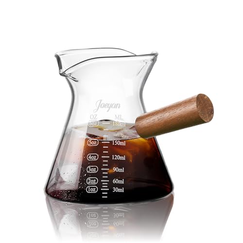 Joeyan180ml/ 6oz Glass Measuring Jug, Small Espresso Shot Glass Measuring Cup with Double Spouts and Wooden Handle, Clear Borosilicate Glasses Milk Creamer Frothing Pitcher Barista Coffee Carafe