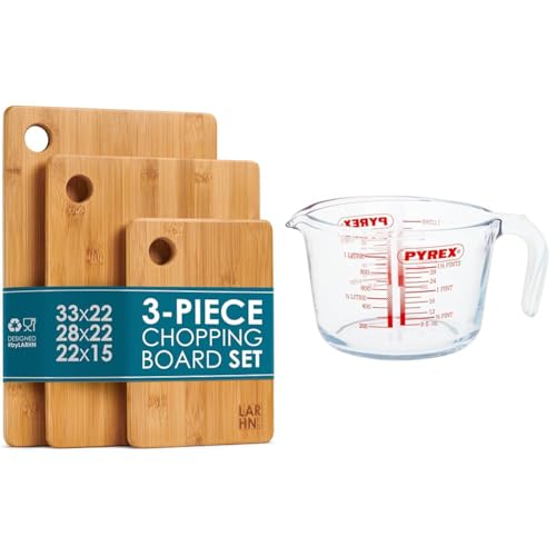 Premium Extra-Thick Wooden Chopping Boards - 3 Piece Bamboo Chopping Board Set & Pyrex Glass Measuring Jug, Transparent, 1 Litre