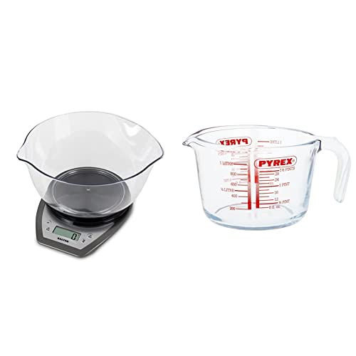 Salter 1024 SVDR14 Dual Pour Electronic Scale with Mixing Bowl, Wide/Narrow Spouts, 2 Litre Bowl, Silver & Pyrex Glass Measuring Jug, Transparent, 1 Litre