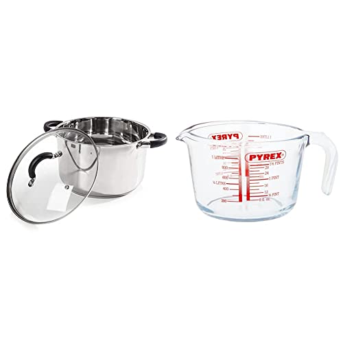 Tower T80837, Casserole Dish, 24cm- Stainless Steel, Silver, 26 x 28 x 17 cm & Pyrex Glass Measuring Jug, Transparent, 1 Litre
