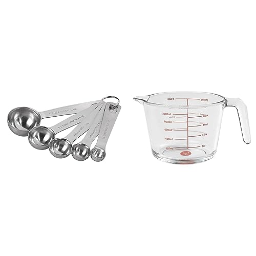 Tala A10550 Stainless Steel Measuring Spoons, 5 Piece Set for Measuring Dry and Liquids + Tala 1 Litre Glass Measuring Jug