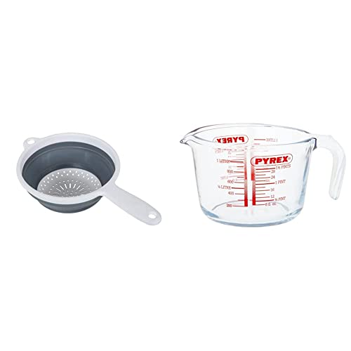 Addis 517522 "Pop & Store Collapsible Food Colander with Handle, White and Grey, 34 x 20 x 3 cm & Pyrex Glass Measuring Jug, Transparent, 1 Litre