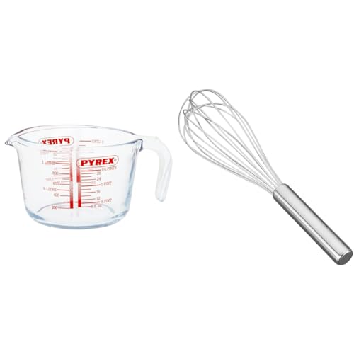 Pyrex Glass Measuring Jug, Transparent, 1 Litre & Metaltex 25 cm Stainless Steel Heavy Duty 8 Wire Whisk, Silver
