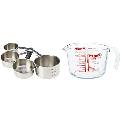 Dexam 17840994 Faringdon Set of 4 Stainless Steel Measuring Cups, 60, 80, 125, 250ml & Pyrex Glass Measuring Jug, Transparent, 1 Litre