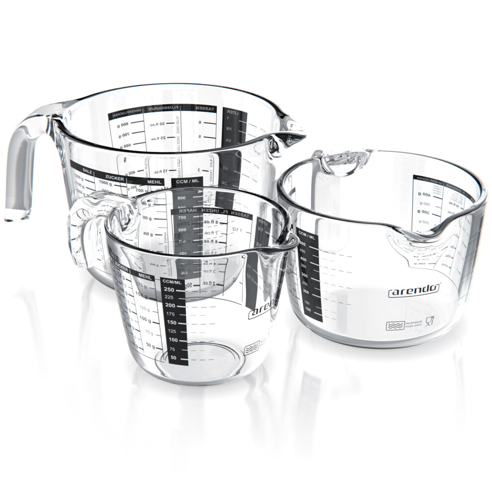 Arendo Set of Glass Measuring jugs, 250ml, 500ml, 1000ml (0.2l 0.5l 1l), Glass Measuring Cup, Transparent Borosilicate Glass Measuring jug, Accurate