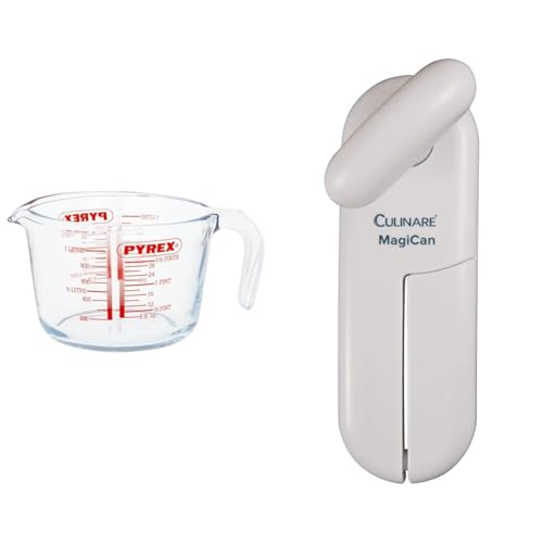 Pyrex Glass Measuring Jug, Transparent, 1 Litre & Culinare C10015 MagiCan Tin Opener, White, Plastic/Stainless Steel, Manual Can Opener, Comfortable Handle for Safety and Ease