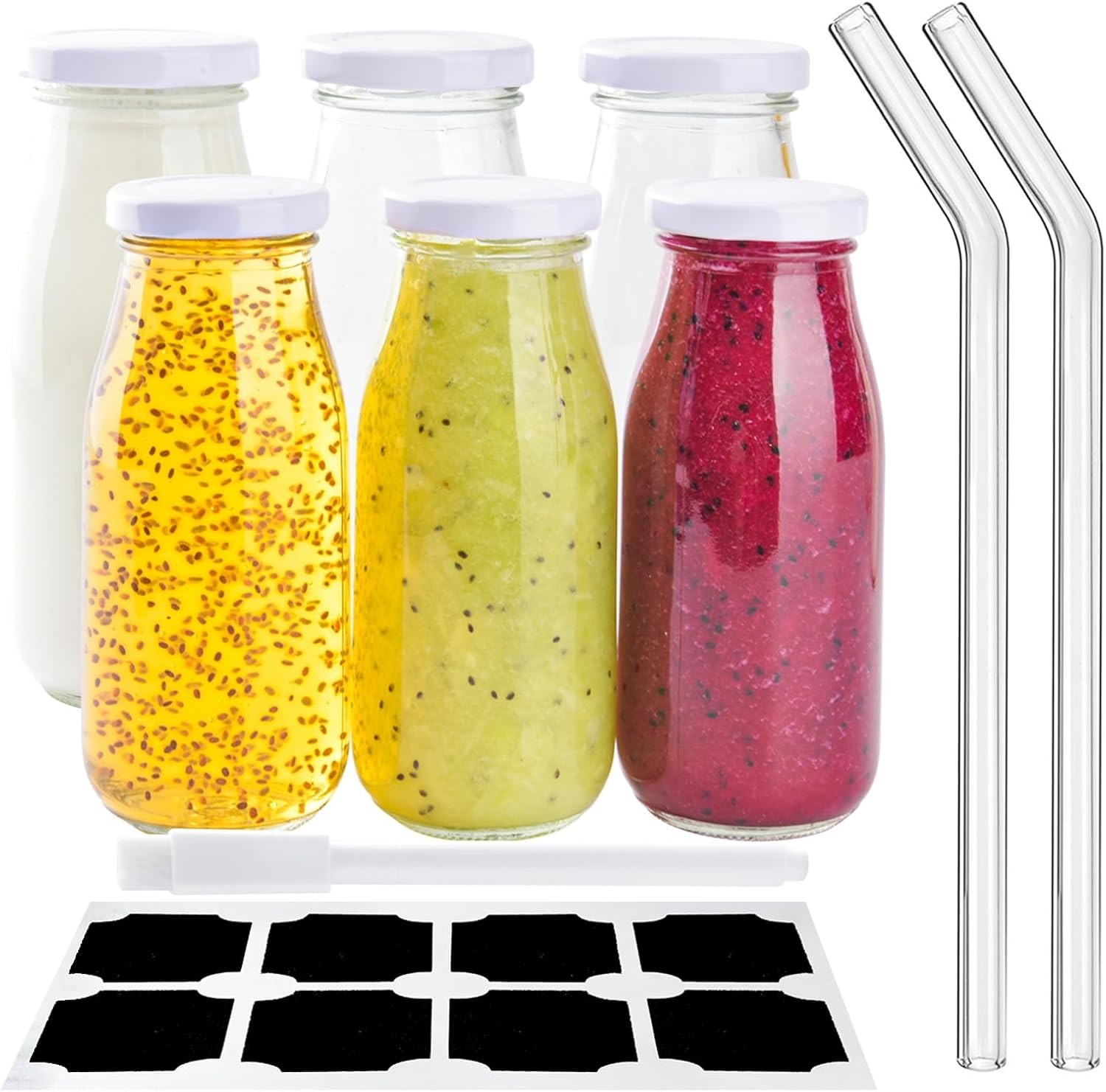 V·Colokishi 6Pcs 250ml Glass Milk Bottles with Lids for Beverages and Storage