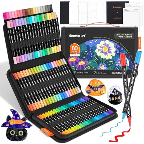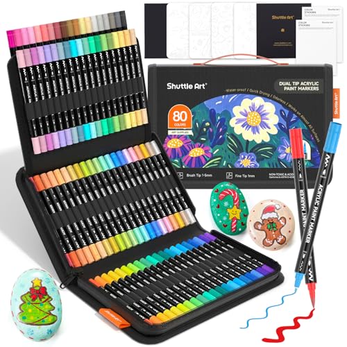 Shuttle Art 80 Colours Acrylic Paint Pens, Dual Tip Fine & Brush Acrylic Markers, Colouring Pens for Rock Painting, Ceramic, Wood, Fabric, Glass, Paint Pens Set for Kids Adults on Christmas Easter