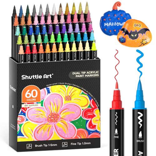 Shuttle Art Dual Tip Acrylic Paint Pens, 60 Colours Fine & Brush Paint Marker Pens, Paint Pens for Rock Painting, Ceramic, Wood, Fabric, Glass, Art Marker Pen Set for Kids Adults on Christmas Easter