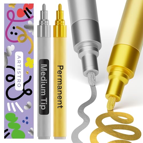 ARTISTRO Metallic Permanent Markers - Set of 2 Gold & Silver Paint Pen, Oil Based Paint Markers Medium Tip 3mm, Waterproof Paint Pens for Rock Painting, Ceramic, Glass, Wood, Tire, Fabric & More