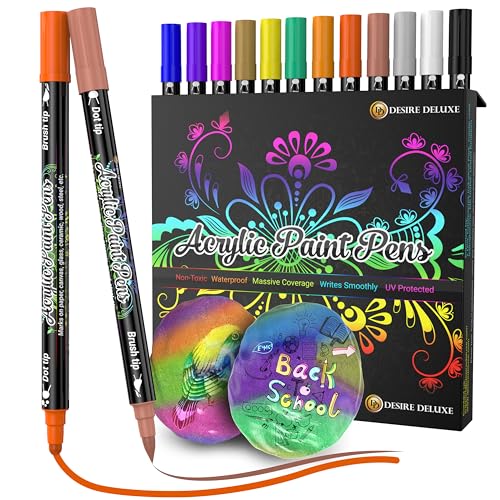 Desire Deluxe Acrylic Paint Pens - Non Toxic Water Based Rock Painting Waterproof Kit Markers for Stone, Ceramic, Glass, Wood, Porcelain, Pebbles - Reversible Round Tip