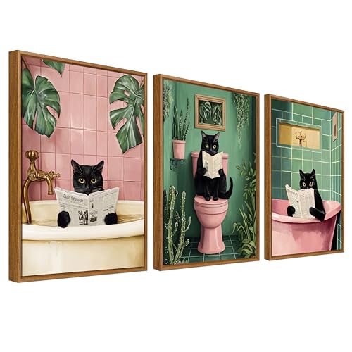 Framed Canvas Wall Art Set of 3 Funny Black Cat Painting Prints for Wall Poster Pink Green Plants Kitten Cat Bathing Pictures for Living Room Bedroom Hallway 30x40cm x3pcs (No Acrylic Glass)