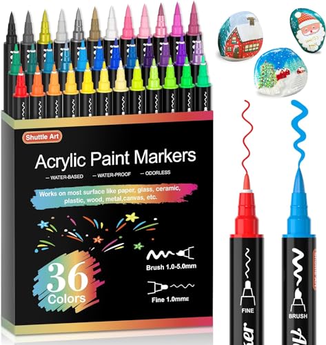 Shuttle Art Dual Tip Acrylic Paint Pens, 36 Colours Fine & Brush Paint Marker Pens, Paint Pens for Rock Painting, Ceramic, Wood, Fabric, Glass, Art Marker Pen Set for Kids Adults on Christmas Easter