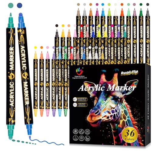 FINGERTIP STORY Acrylic Paint Pens, 36 Colours Dual Tip Acrylic Pens for Rock Painting, Wood, Glass, Ceramic, Stones, Fabric, Canvas, Craft, Waterproof Brush Pens, Acrylic Marker Pen Set