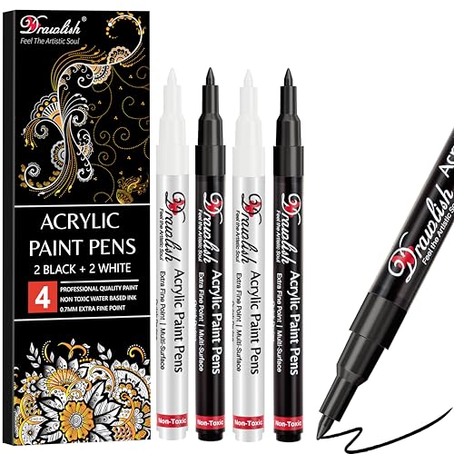 Drawlish Acrylic Paint Pens, Black & White Pen Set of 4 Glass Paint Markers 0.7mm Extra Fine Tip | Ideal for Wood, Fabric, Porcelain, Ceramic, Stone, Rock Painting and more