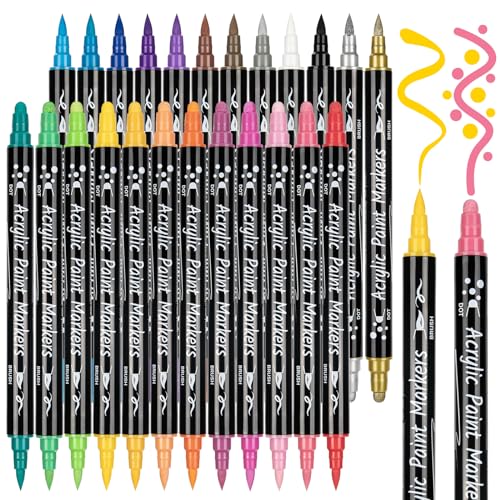AOSUCO Acrylic Paint Pens: 24 Colours Dual Tip Acrylic Pens for Rock Painting, Wood, Pebbles, Glass, Ceramic, Stones, Fabric, Canvas, Craft, Waterproof Brush Pens Paint Marker Pen Set