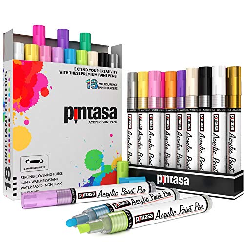 PINTASA Acrylic Paint Pens - 18 Rock Paint Markers - Quick Dry Acrylic Paints Set, Canvas, Ceramic, Porcelain, Wood, Mug, Fabric, Kids DIY Crafts | Glass Colouring Kit Painting Set and Water Based Ink