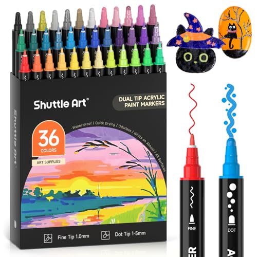 Shuttle Art Dual Tip Acrylic Paint Pens, 36 Colours Dot & Fine Tip Paint Marker Pens, Paint Pens for Rock Painting, Ceramic, Wood, Fabric, Glass, Art Marker Pen Set for Kids Adults on Christmas Easter