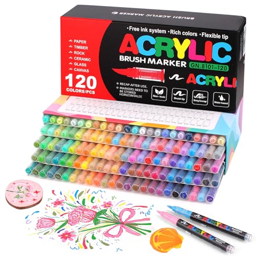 Gunsamg 120 Colors Acrylic Paint Marker Set – Water-Based Paint Pens with Flexible 1-5mm Brush Tip for Rock, Ceramic, Glass, Stone, Metal, Fabric Painting