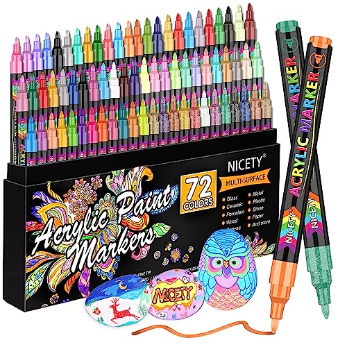 NICETY Acrylic Paint Pens Set - 72 Colours Paint Markers for Rock Painting Stone Glass Ceramic Wood Metal Fabric - 0.7mm Extra Fine Tip Water Based Acrylic Markers for Adults
