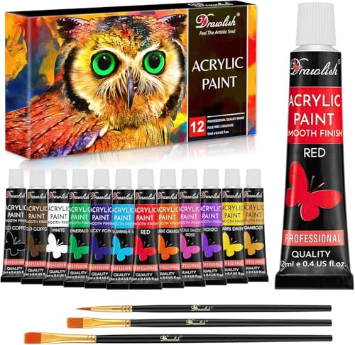Drawlish Acrylic Paints Set of 12 with 3 Paint Brushes & (12ml) Tubes | Highly-Pigmented Fabric Paint | Ideal for Canvas, Wood, Ceramic, Glass & Rock Painting