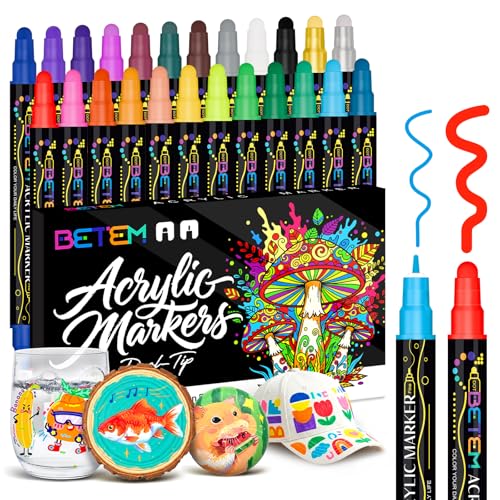 Betem 24 Colors Dual Tip Acrylic Paint Pens Markers, Premium Colouring Pens for Rock Painting, Wood, Canvas, Stone, Glass, Ceramic Surfaces, Christmas Painting Kit DIY Crafts Making Art Supplies